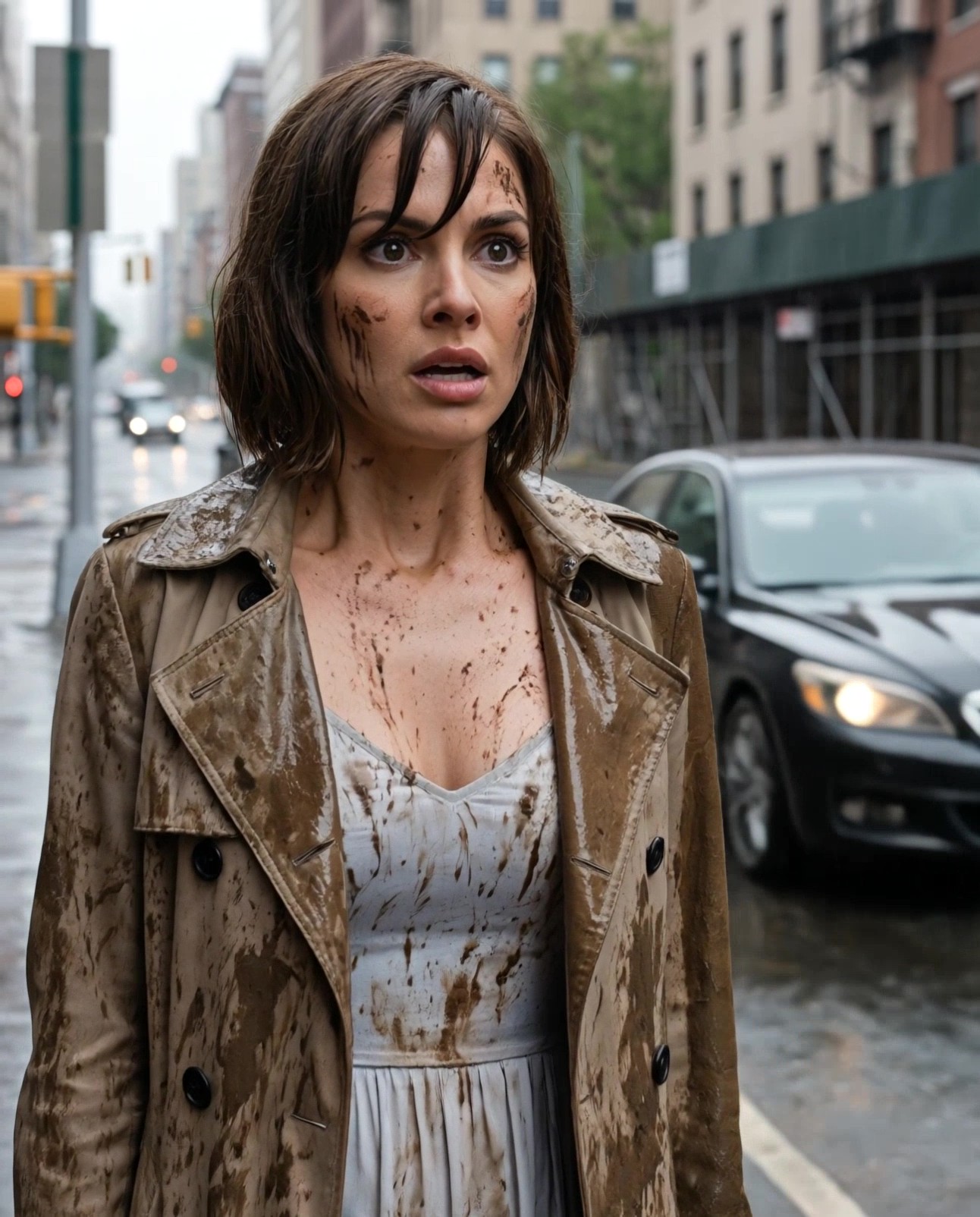 Cold, muddy water hit me full force—soaking my light-colored dress, splashing across my bag, and even striking me across the cheek.