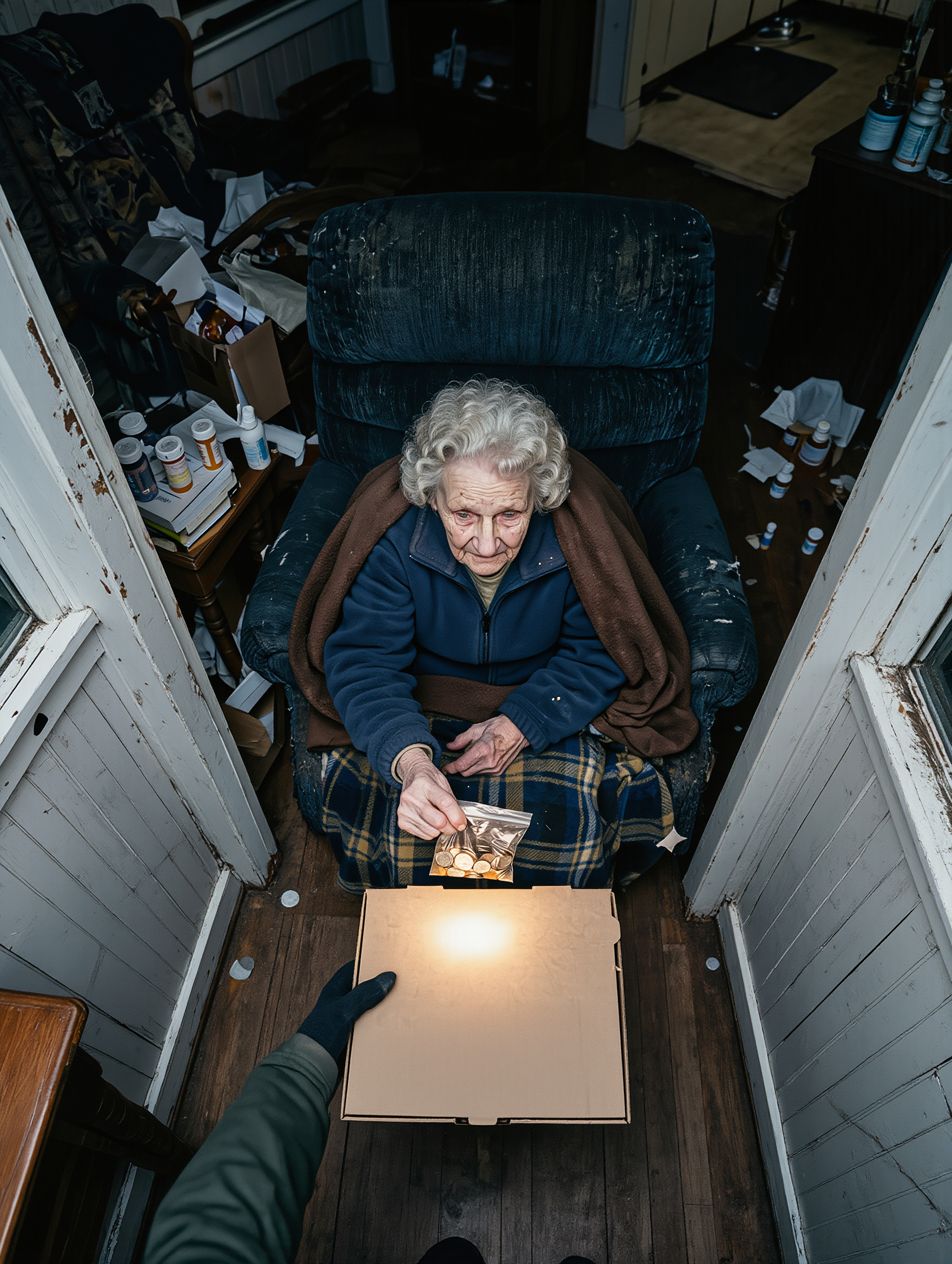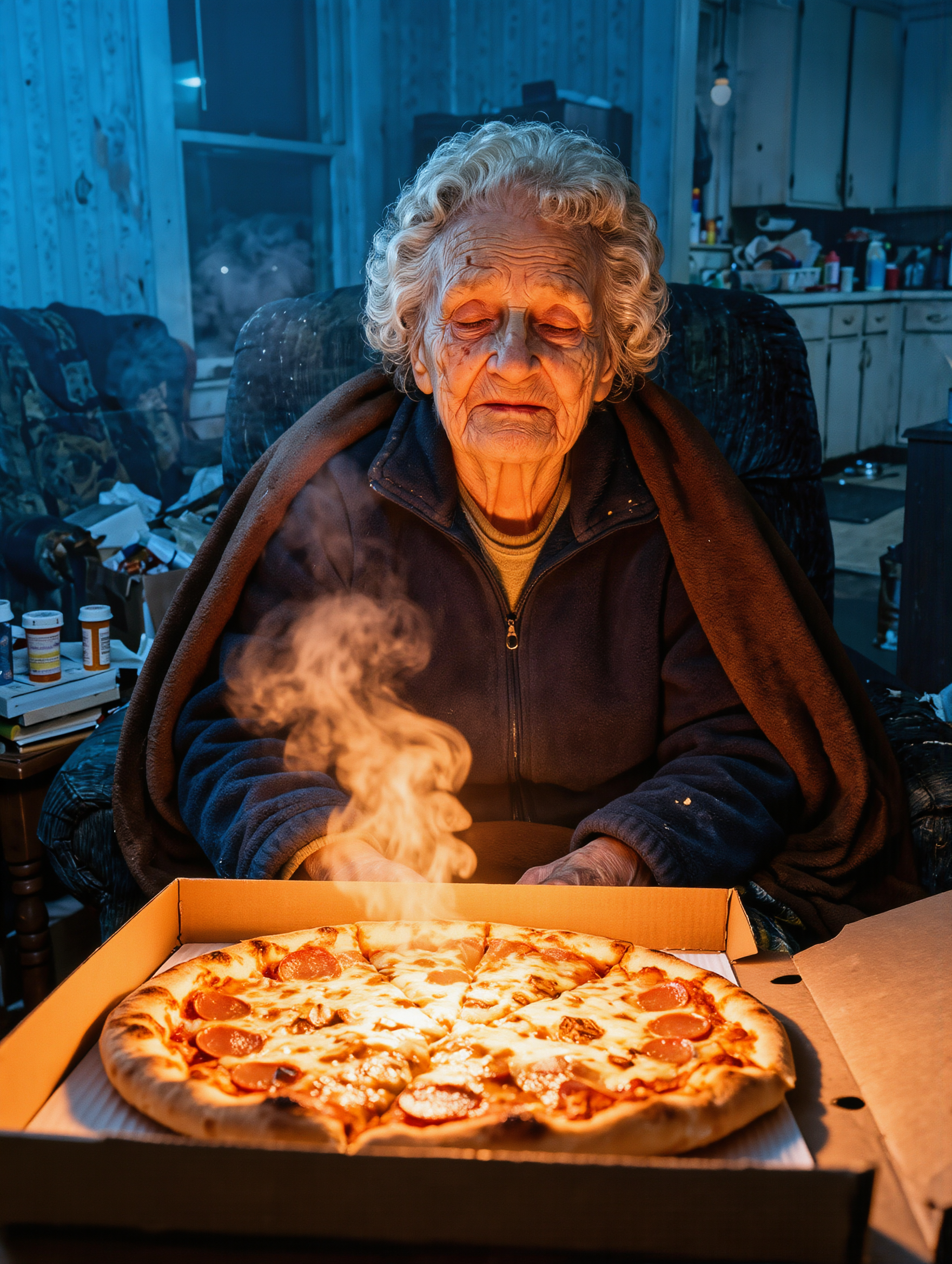 I stepped into a small living room. An older woman sat in a worn recliner, bundled in so many blankets her head looked almost comically small. A candle flickered beside her. Her eyes locked onto the pizza box.