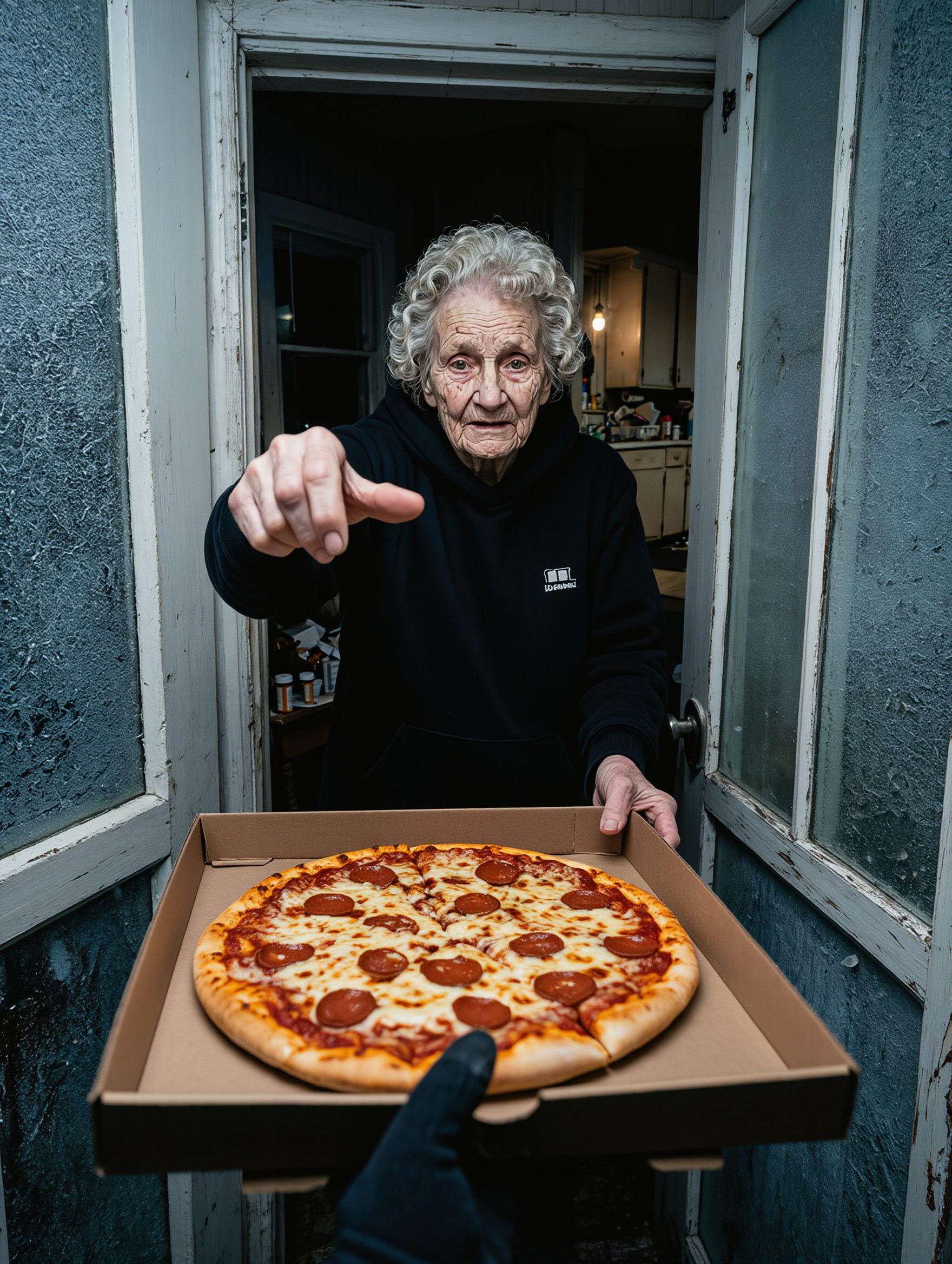 The March air that night had teeth. Standing on the back steps with a large pepperoni pizza balanced in one hand and my phone in the other, I already sensed something was off about this delivery.