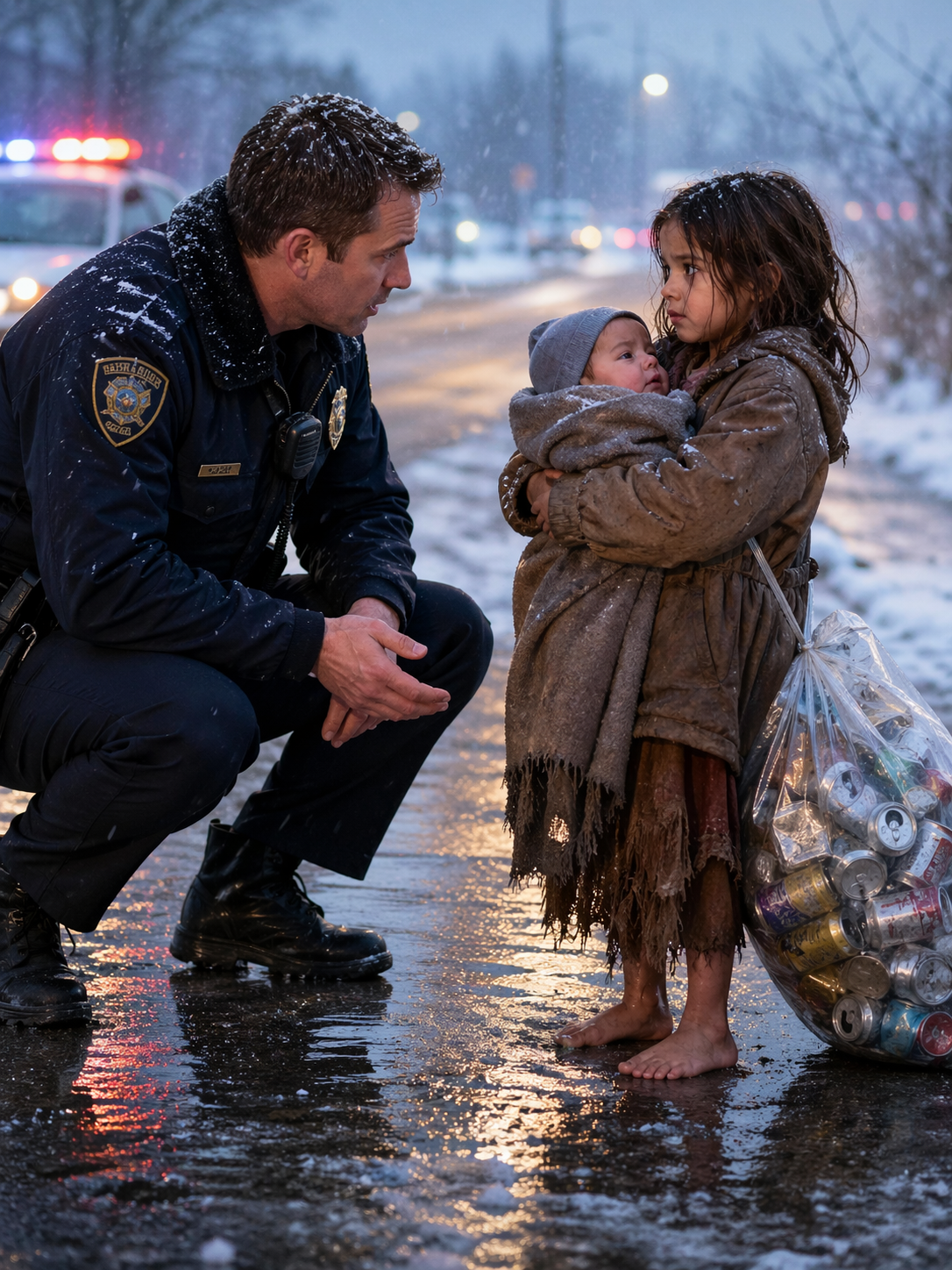 Barefoot, she stepped carefully across the cold pavement, her toes curling slightly with each step. An oversized sweatshirt hung loosely over her tiny frame, sleeves swallowing her hands. Dirt marked her cheeks, and faint streaks beneath her eyes showed she had cried recently.
