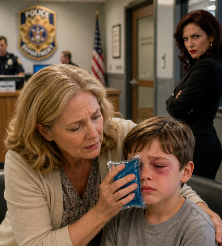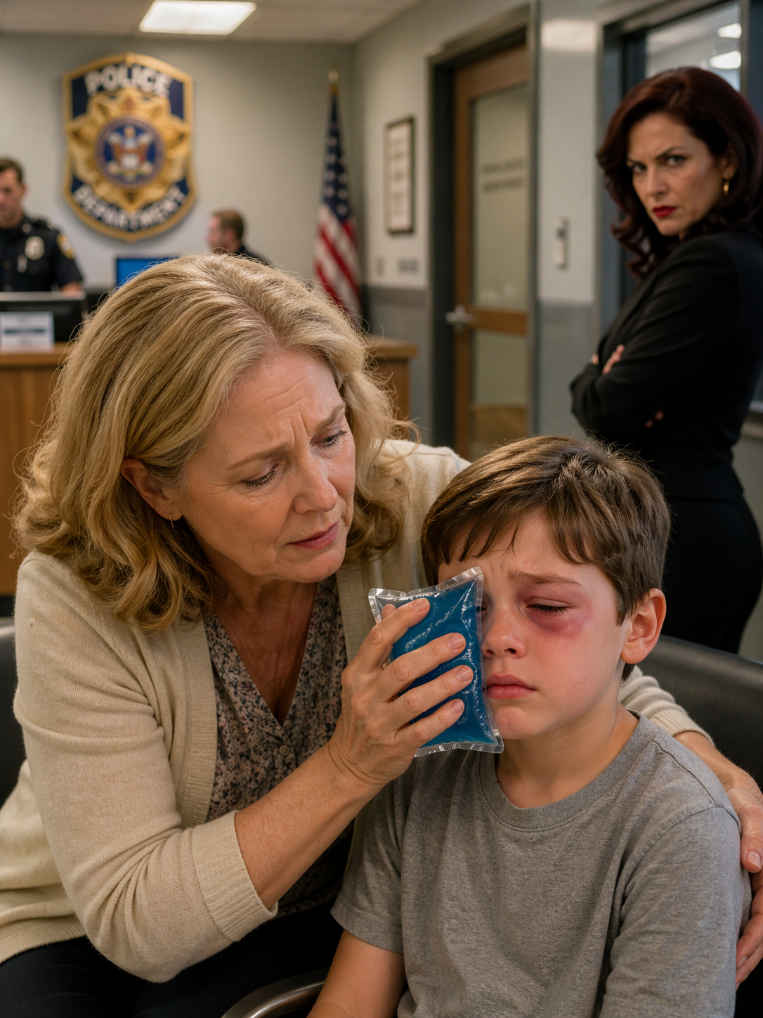By the time I reached the station, the fluorescent lights were still harsh and unforgiving, casting everything in that same sterile glow I remembered too well. Ethan sat slumped in a chair, shoulders drawn in, a makeshift ice pack pressed against a deep cut above his eyebrow.